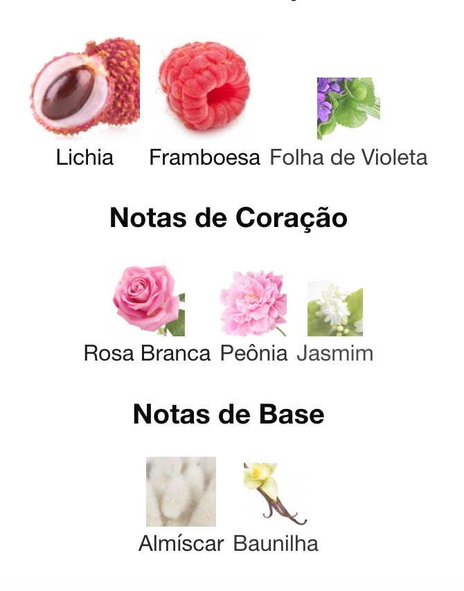 - Notas de topo: A abertura é doce e fresca, com a suculência exótica da lichia, a doçura vibrante da framboesa e o toque delicado e verde da folha de violeta. Esta introdução é encantadora e energizante.
