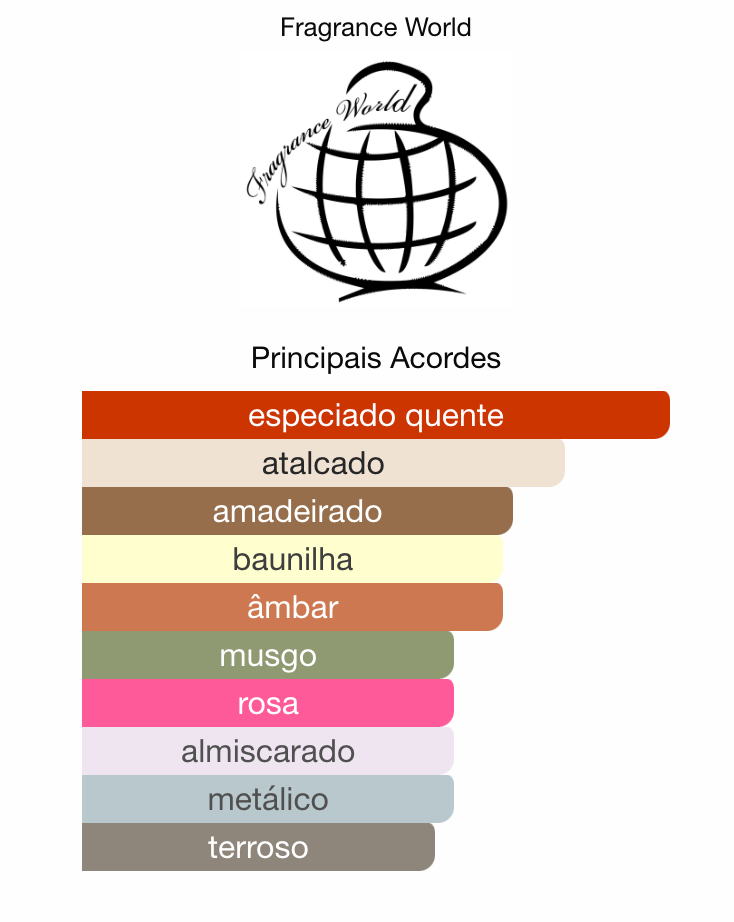 - Notas de coração: âmbar, madeira, rosa marroquina, jasmim egípcio, folhas de patchouli da Indonésia.