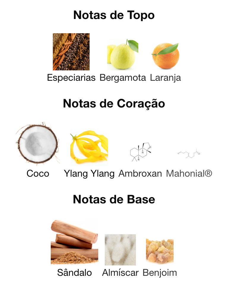 - Notas de coração: No coração, a riqueza tropical do coco encontra o exotismo floral do ylang-ylang, harmonizados com o brilho ambarado do ambroxan e a sofisticação moderna do mahonial. Este bouquet cria uma camada rica e encantadora.