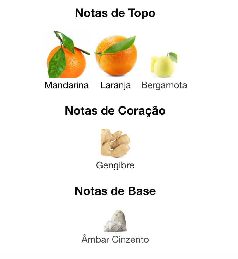 - Notas de topo: bergamota, tangerina, laranja.