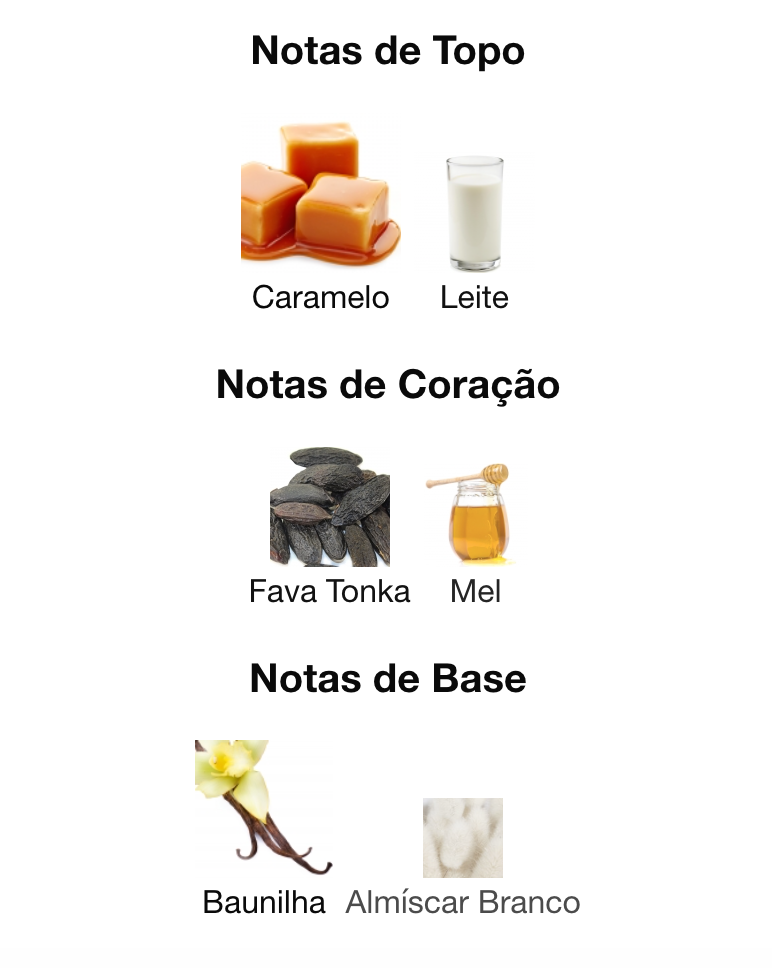- Notas de cabeça: A abertura é pura indulgência, com o doce e reconfortante caramelo fundindo-se ao toque cremoso do leite, criando uma introdução gourmand que captura os sentidos instantaneamente.